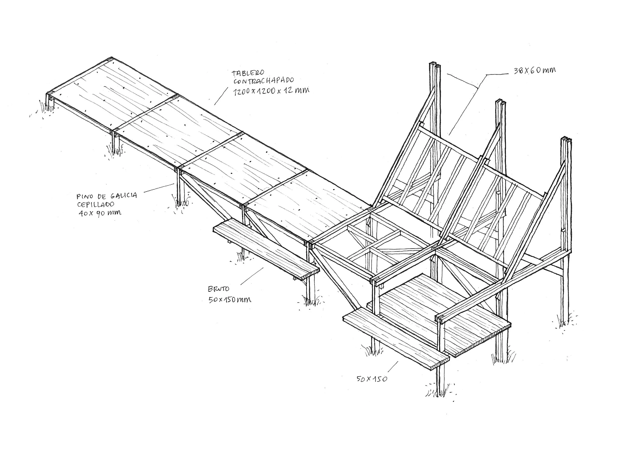The main goal was to promote the use of wood as a building material in the forestry region of Galicia, Spain, through education in design and construction techniques. The rocky coastline on the surroundings of Barrañan beach at the Arteixo Municipality area, was chosen as an area that could support possible lightweight infrastructures which would mark and connect existing paths along the Atlantic coast.