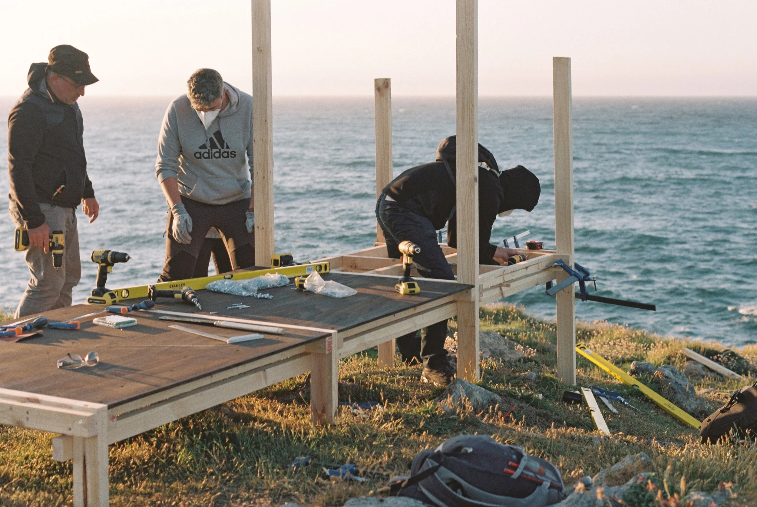 This way, once the first modules were installed, the platform became a work table. This was used as support for preparing the remaining components, and with these, to build benches, an observation platform and two sloped modules, to be used as support or seat for eastward observation, as well as protection from the wind when facing west. This way, the structure was finished on site and using hand powered tools.